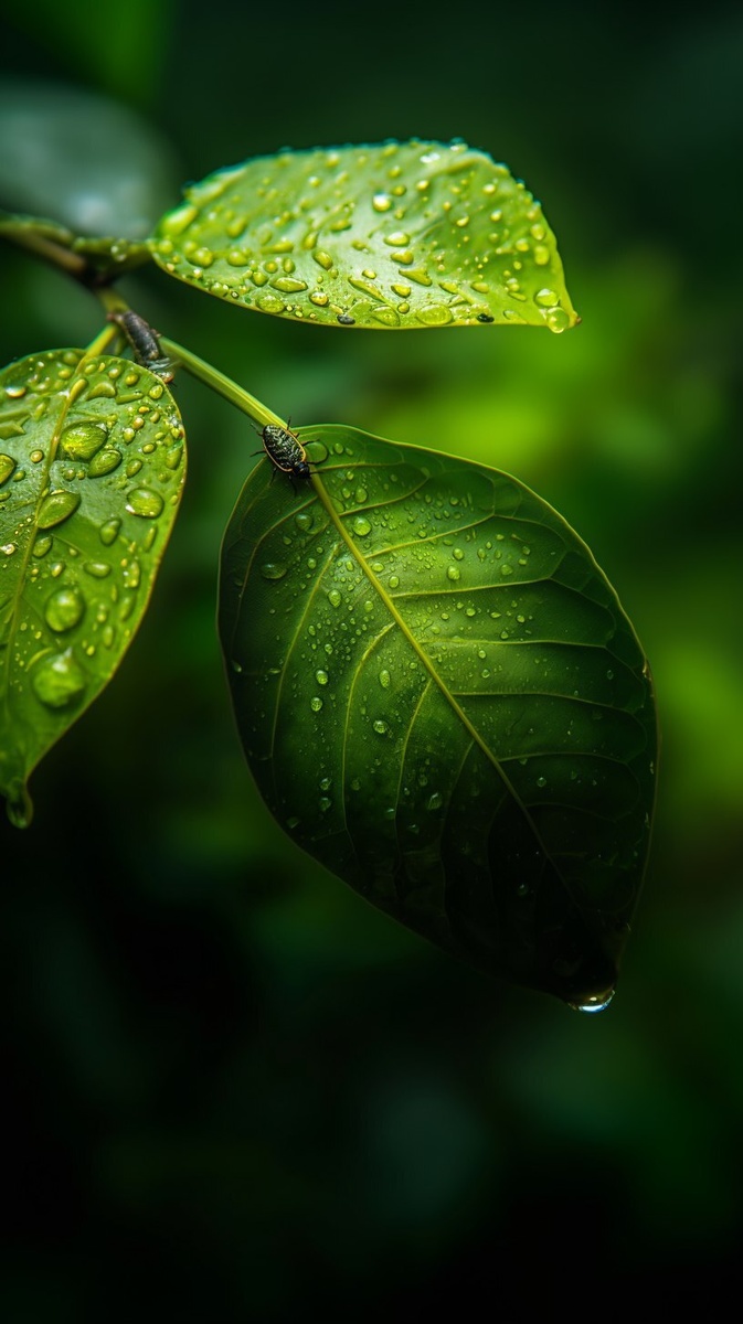 Создано на основе запроса: macro view of a few leaves on a small branch, early morning light, soft bokeh background
