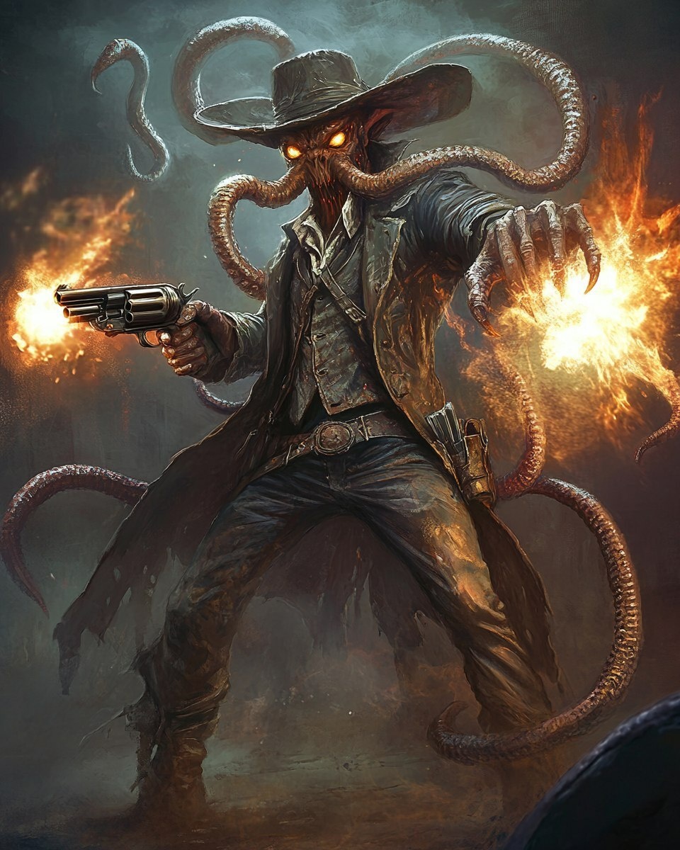 Создано на основе запроса: Man, full body, Cowboy, master of the undead, holds a Gatling gun in his hand and projects fireballs in the other hands, cthulhu ambiance, ultra realistic --- Автоперевод: Человек, полное тело, ковбой, мастер нежити, держит в руке пистолет и проецирует огненные шары в других руках, Cthulhu Ambiance, Ultra Realistic Красиво получилось? 🤔 https://dzen.ru/id/65c0c65c86e4f837c27b24d7 #ИИ #AI #нейросеть #midjourney #art