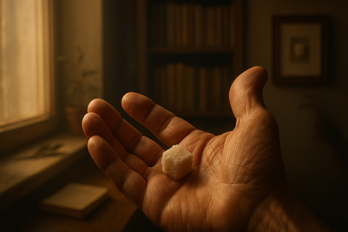 Просто… сахар. Молчание комнаты как будто стало плотнее. Он ощутил, что держит не еду. Он держит чью-то память. Он встал, открыл окно — и в тишине под вечерний воздух глядел на сахар, как на древнее послание. Сердце отозвалось каким-то странным теплом и стыдом