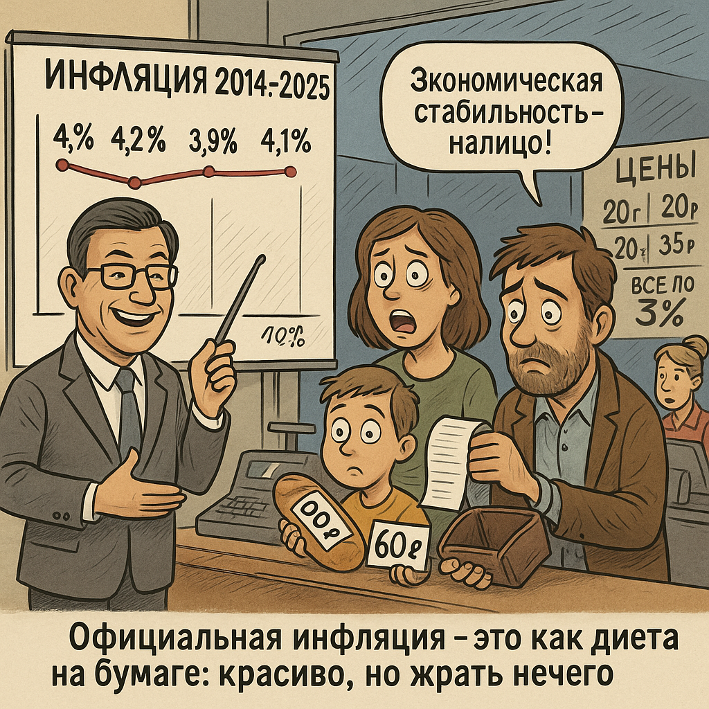 Можно, конечно, радоваться за Росстат – у них всё под контролем, инфляция низкая, экономика в порядке. А можно взглянуть в чек из супермаркета: там своя статистика, не такая красивая, зато честная. В России шутят: «Мы не против таргета 4% – мы бы тоже хотели такую инфляцию!». Пока же таргет живёт на бумаге, а мы – в реальном мире высоких цен.