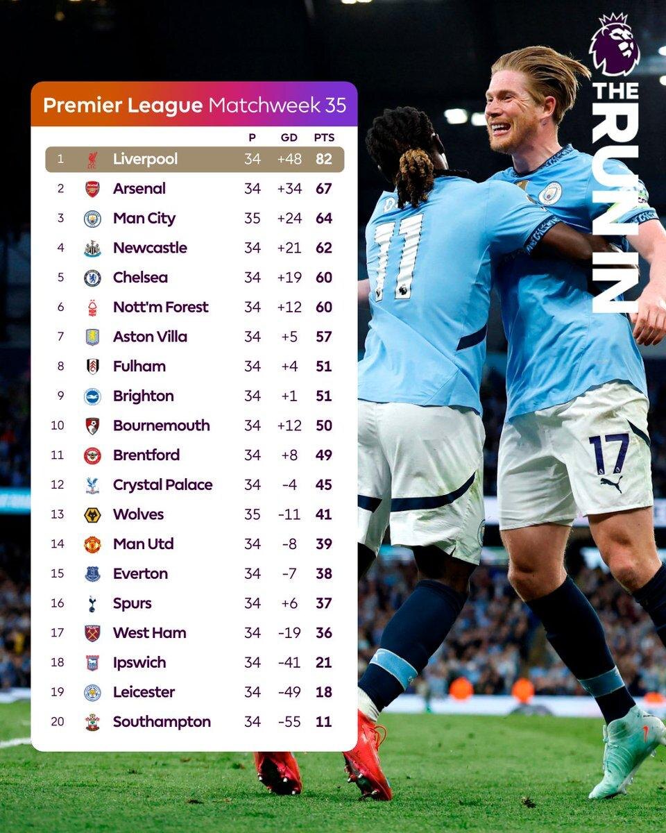 После победы 1:0 над "Вулверхэмптоном" "Манчестер Сити" поднялся на третье место в Премьер-Лиге — "Арсенал" всего в трех очках впереди ☝️