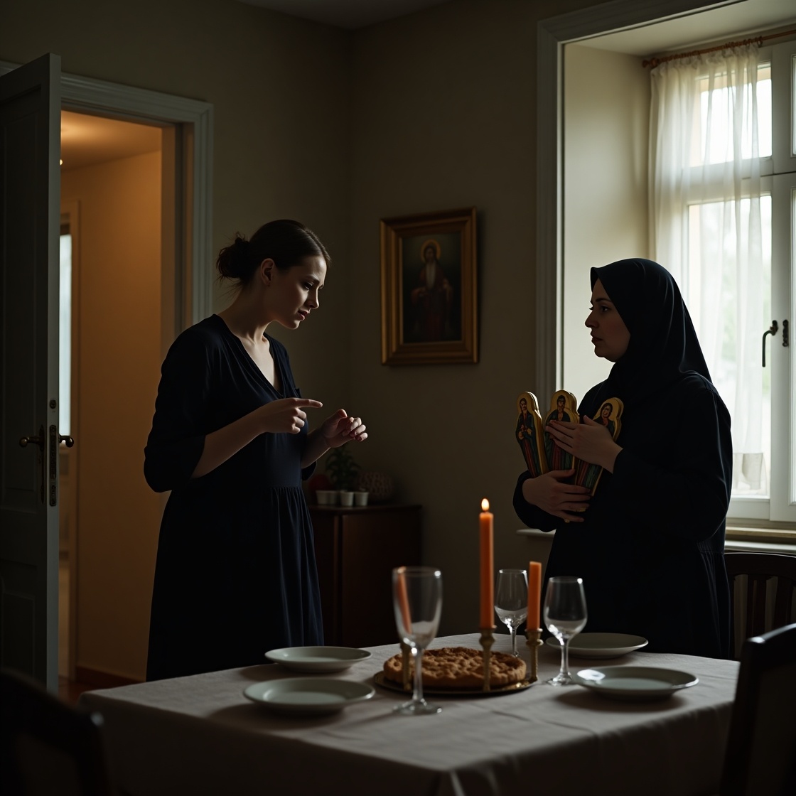 Она поставила иконы на стол, прямо рядом с праздничными тарелками.