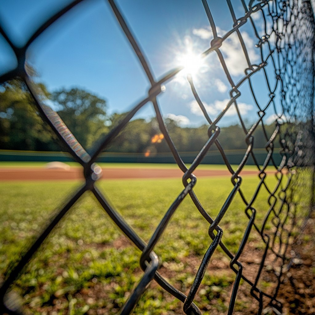 Создано на основе запроса: realistic photography of a baseball field low perspective, sunny day in VA, view from behind the fence view of