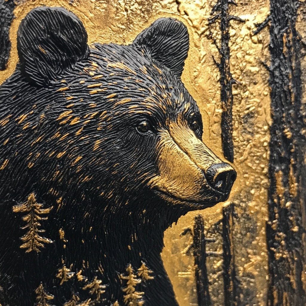Создано на основе запроса: gold embossed black bear in woods, close up view