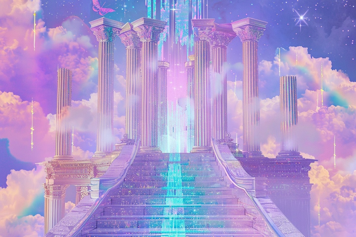 Создано на основе запроса: A surreal, floating Akashic temple in the cosmos, built of luminous white marble and glowing pastel columns. A grand staircase made of light and crystal leads up to the temple, surrounded by holographic butterflies, glittering cosmic vines, and floating ethereal symbols. A radiant waterfall of liquid light flows beneath the staircase into a celestial pool. The sky is filled with pastel auroras, nebula clouds, and stars in colors #DEFE08, #9800FF, #D400FF, #01E8CF, and #FDBBAC. Temple radiates divine feminine energy, abstract and high-resolution, oracle card style, cinematic lighting, otherworldly and elegant --- Автоперевод: Сюрреалистический, плавающий храм Акаши в космосе, построенный из светящегося белого мрамора и светящихся пастельных колонн. Неплохо выглядит? 🤔 https://dzen.ru/id/65c0c65c86e4f837c27b24d7 #ИИ #AI #нейросеть #midjourney #art