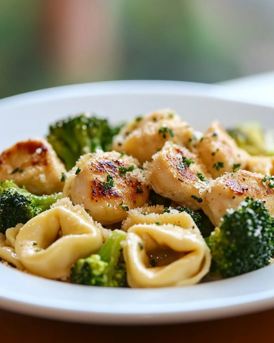 Создано на основе запроса: | Title: Garlic Parmesan Chicken Tortellini and Broccoli | Close-up Shot right view, taken by a photographer with