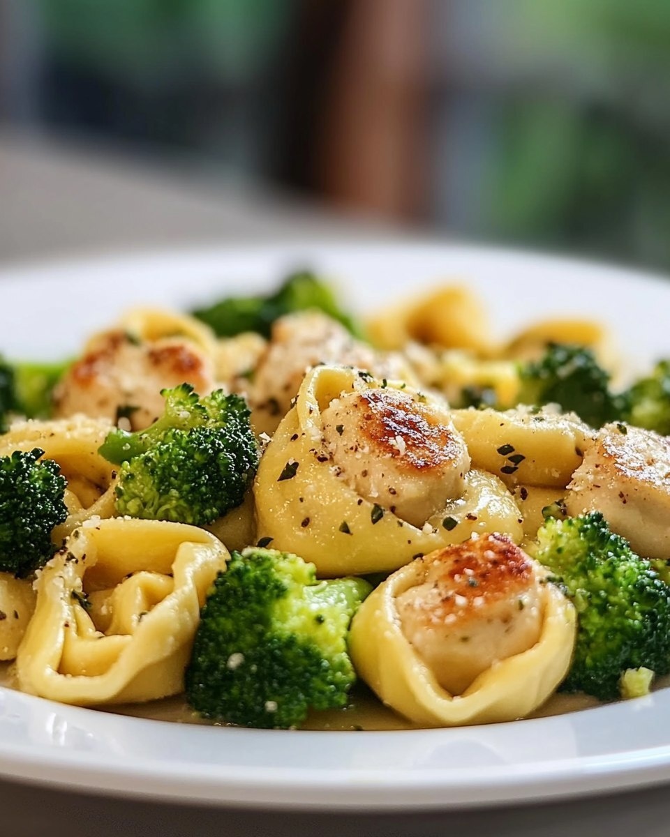 Создано на основе запроса: | Title: Garlic Parmesan Chicken Tortellini and Broccoli | Close-up Shot right view, taken by a photographer with