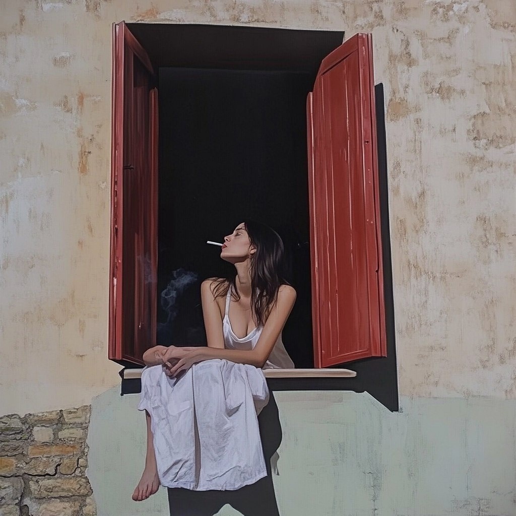 Создано на основе запроса: this exact picture : with girl sitting in the window smoking a cigarette