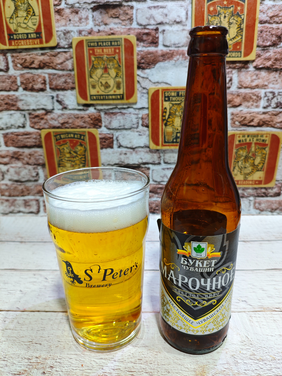 Изготовитель: ОАО "Чебоксарская пивоваренная фирма "Букет Чувашии", г.Чебоксары Чувашской Республики. Сайт пивоварни рассказывает следующее: Светлое пиво сваренное по классической технологии с применением натурального высокого качества сырья, кукурузная крупа, входящая в состав пива, придает насыщенный вкус. Его неповторимое послевкусие делает этот напиток особенным и запоминающимся. Не просто пиво, а пиво высокой марки качества. Произведенно в процессе естественного брожения из солодового сусла с применением кукурузной крупы. Манящий аромат и гармоничный вкус пива с приятной хмелевой горечью не оставят вас равнодушными. ********************************************************************************** Плотность: 13%. Состав: вода питьевая очищенная, солод пивоваренный ячменный светлый, крупа кукурузная, сахар, хмелепродукты, дрожжи пивные. Срок годности: 210 суток при температуре хранения от +5℃ до +20℃. С даты розлива моей бутылки прошло чуть менее 3-х месяцев. *********************