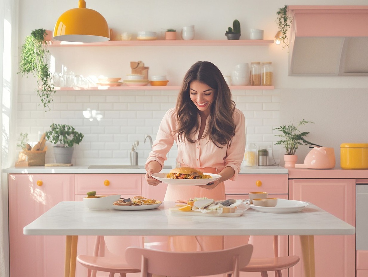 Автоперевод: Фотография изображения брюнетки, приносящей еду на кухонный стол, кухня имеет коралловые акценты, легкий и воздушный фон,