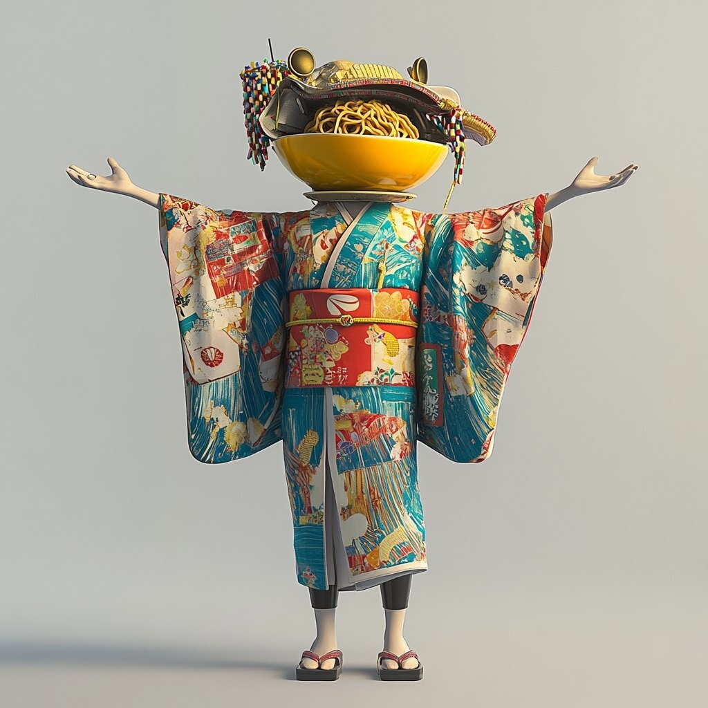 Создано на основе запроса: 3d avatar of a person with a ramen bowl for a head, full body, arms outstretched to either side, human body, wearing traditional Japanese festival (matsuri) clothing, vibrant yukata, happi coat, colorful festival decorations, detailed textures, cheerful pose, stylized 3d rendering, high quality, sharp details --- Автоперевод: 3D Аватар человека с раменной миской для головы, всего тела, рук, вытянутых по обе стороны, человеческому телу, в традиционной японской фестивальной одежде (Matsuri), яркой юкате, пальто Happi, красочные украшения фестиваля, подробные текстуры, веселая поза, стилизованная 3D -рендеринга, высокое качество, резкие детали, резкие детали, текстуры, веселая поза, стилизованная 3D -рендеринги, высокое качество, резкие детали, подробные текстуры. Какое твое впечатление? 🤔 https://dzen.ru/id/65c0c65c86e4f837c27b24d7 #ИИ #AI #нейросеть #midjourney #art