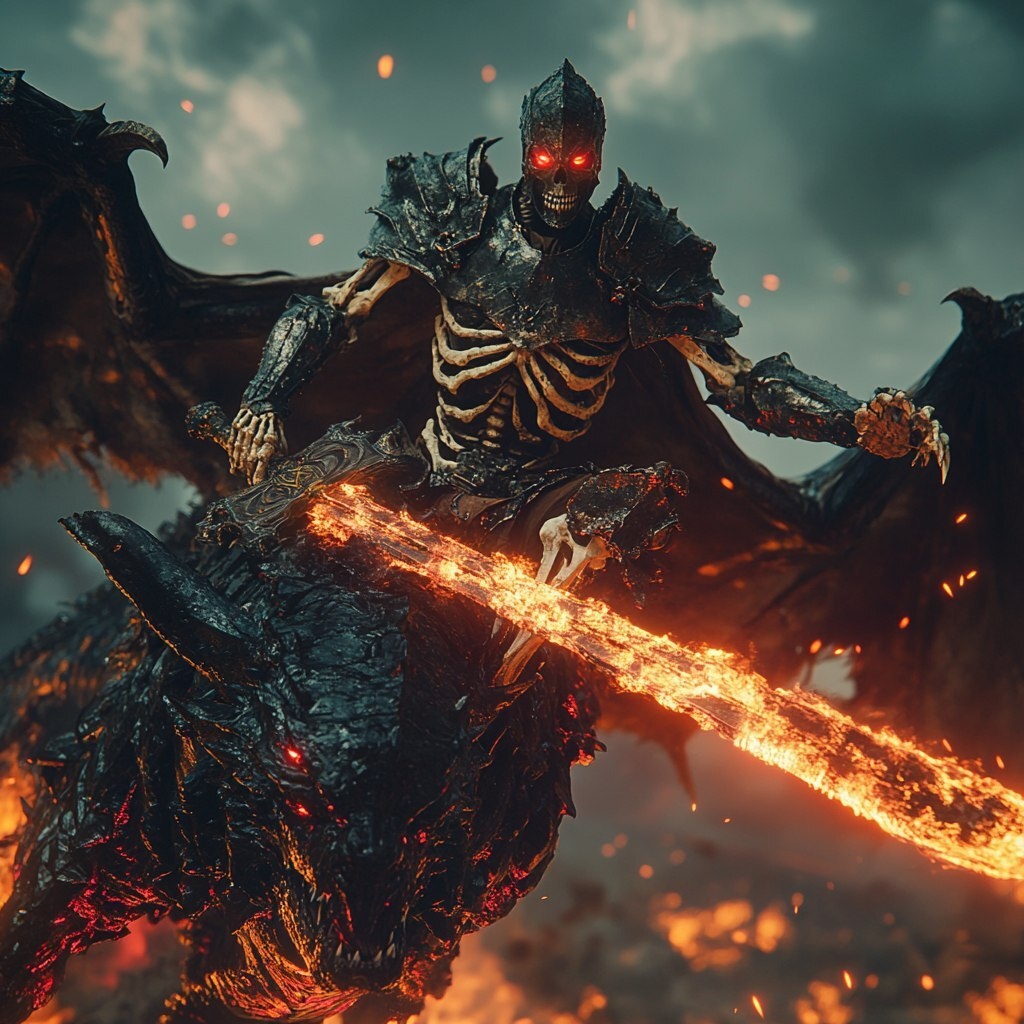 Создано на основе запроса: A hyper-realistic undead skeleton knight in ancient, cracked armor, wielding a cursed sword glowing with dark energy, riding a massive black dragon with glowing red eyes and tattered wings, flying over a burning battlefield at dusk, ash and embers in the air, epic cinematic lighting, dark stormy skies, ultra-detailed textures, 8k resolution, fantasy realism, dramatic composition, photorealistic style --- Автоперевод: A hyper-realistic undead skeleton knight in ancient, cracked armor, wielding a cursed sword glowing with dark energy, riding a massive black dragon with glowing red eyes and tattered wings, flying over a burning battlefield at dusk, ash and embers in the air, epic cinematic lighting, dark stormy skies, ultra-detailed textures, 8k resolution, fantasy realism, dramatic composition, photorealistic Хорошо выглядит? 🤔 https://dzen.ru/id/65c0c65c86e4f837c27b24d7 #ИИ #AI #нейросеть #midjourney #art