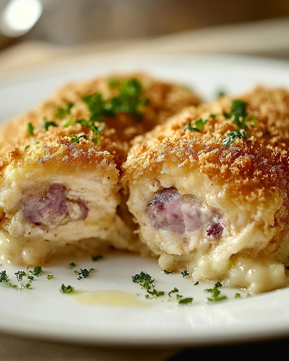 Создано на основе запроса: | Title: Chicken Cordon Bleu Casserole | Close-up Shot right view, taken by a photographer with a high quality