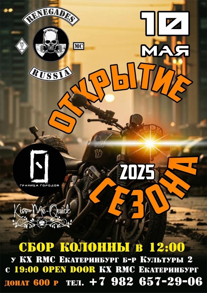 Дорогие друзья!!! 10 мая приглашаем вас на открытие мото сезона от RENEGADES MC Екатеринбург!!! Присоединитесь к прохвату мото колонны!!! А вечером ждем вас в клаб хаусе RENEGADES MC Екатеринбург по адресу культуры 2. На торжественную честь открытия!!! Будет круто и весело!!! Разбудим этот город ревом моторов и громкой музыкой!!!🔥🔥🤘 Motorcycle •[ЕКБ] МОТО• #мотосезон2025 #екатеринбург #ekbmoto #moto Источник