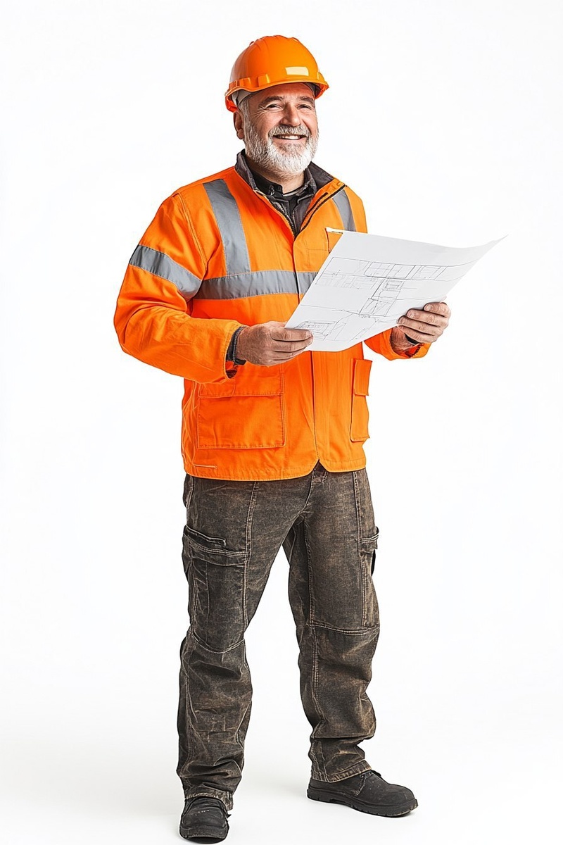 Создано на основе запроса: a joyful male construction worker in safety vest and helmet, full body, holding blueprints, white background