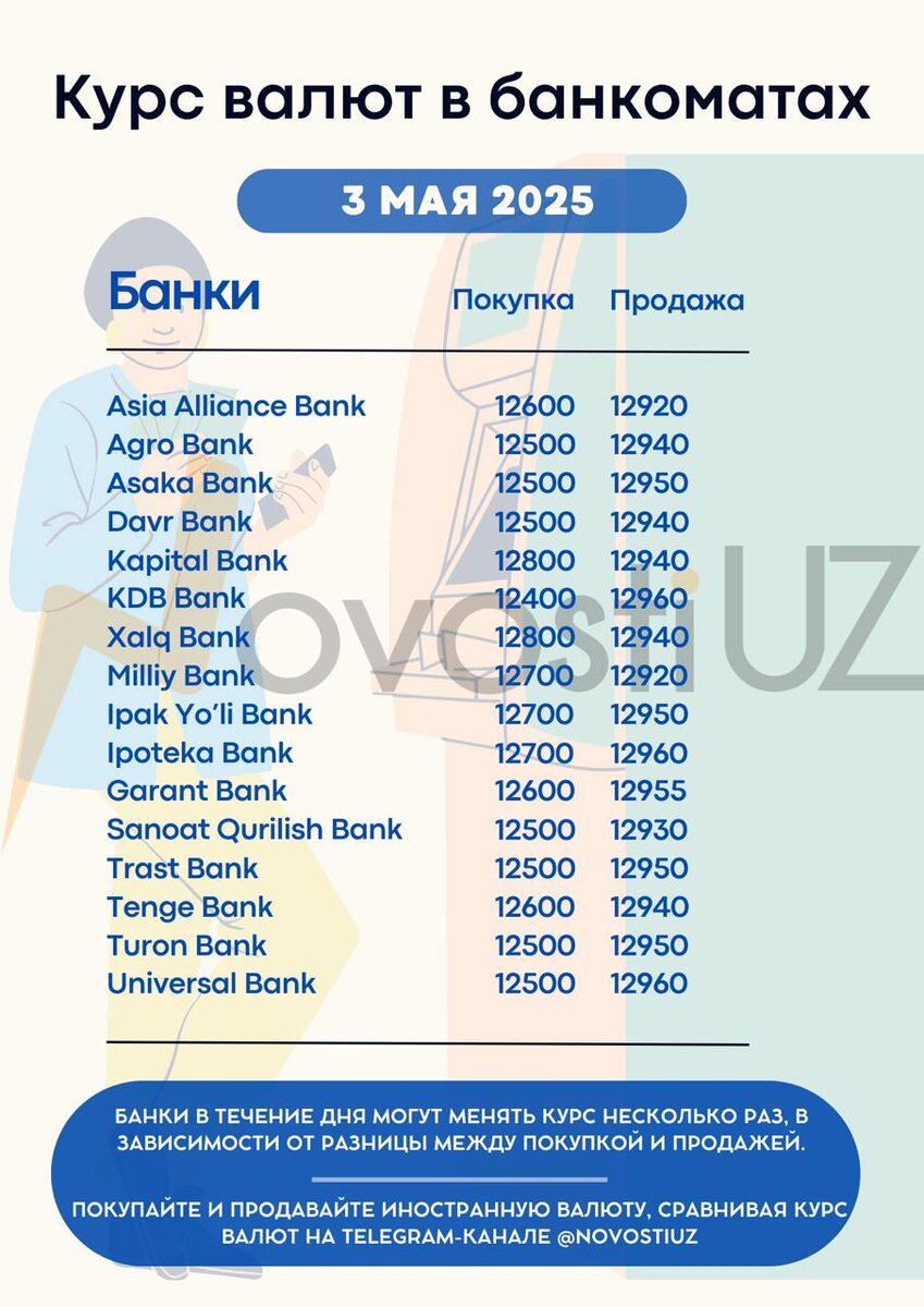 • 🌸💵Где безопасно обменять валюту в выходные? Выходные нередко создают сложности для тех, кто хочет обменять валюту, ведь многие банки не работают. Однако, чтобы избежать рисков и совершить безопасный и выгодный обмен, важно выбирать проверенные варианты. 🔹 Самый надежный способ – воспользоваться банкоматами, которые предоставляют услугу обмена валют. 🔹 Мы подготовили актуальные курсы в популярных банкоматах города, чтобы вам было проще найти выгодный вариант. 🔹 Избегайте нелегальных обменных точек – это не только риск потери денег, но и нарушение закона. 🔒 Подпишитесь на единственный официальный канал @NоvоstiUZ / Новости Узбекистана, чтобы быть в курсе всех важных новостей и курсов валют! 👉 https://telegram.me/NovostiUZ/56269