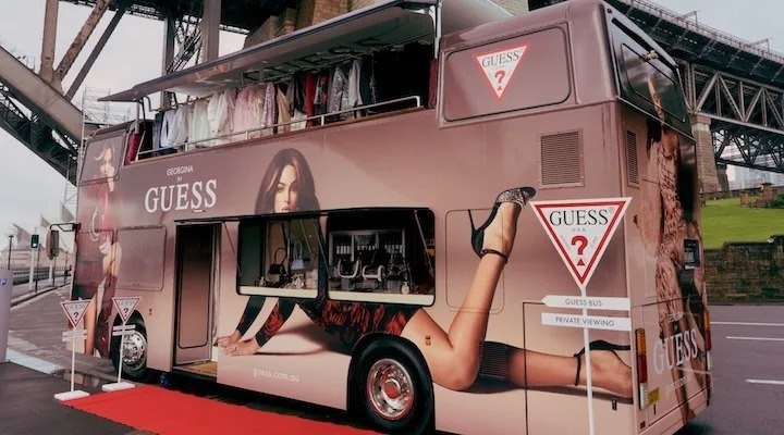 Вместо скучной и традиционной, GUESS запускает передвижной бутик Guess Bus. сделанный из двух этажного автобуса, где представлена последняя коллекция. На первом этаже - аксессуары и косметика. Второй - одежда и прочее. Плюс бесплатная примерка и фотозона для социальных сетей. За 6 дней рекламной кампании автобус посетит все злачные популярные места Сиднея в Австралии.