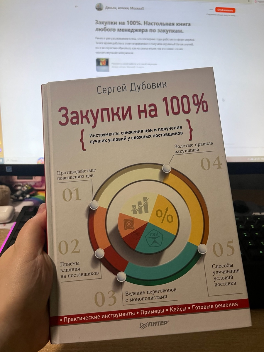 Ранее я уже рассказывала о том, что последние годы работаю в сфере закупок. За все время работы в этом направлении я получила огромный багаж знаний, но я не перестаю обучаться, как на своем опыте, так и в плане чтения соответствующих материалов. Одна из книг, которую я достаточно давно прочитала и считаю ее настольной книгой закупщик - Сергей Дубовик "Закупки на 100%" Первый раз я столкнулась с этой книгой, когда только начинала работать на заводе в отделе закупок. Тогда я скачала ее в электронном формате на телефон и пыталась дважды начать читать. Это все закончилось тем, что я ни разу не прочитала даже страниц 10, потому что такой формат для чтения подобной литературы не подходит. В планах было приобрести себе бумажную версию, но пока она лежала в корзине - книга сама пришла ко мне в руки, как один из полезных трофеев за участие в конкурсе "Закупочная команда", где мы заняли второе место, но это отдельная история :) Огромный плюс данной книги - она описывает системы и процессы, кото