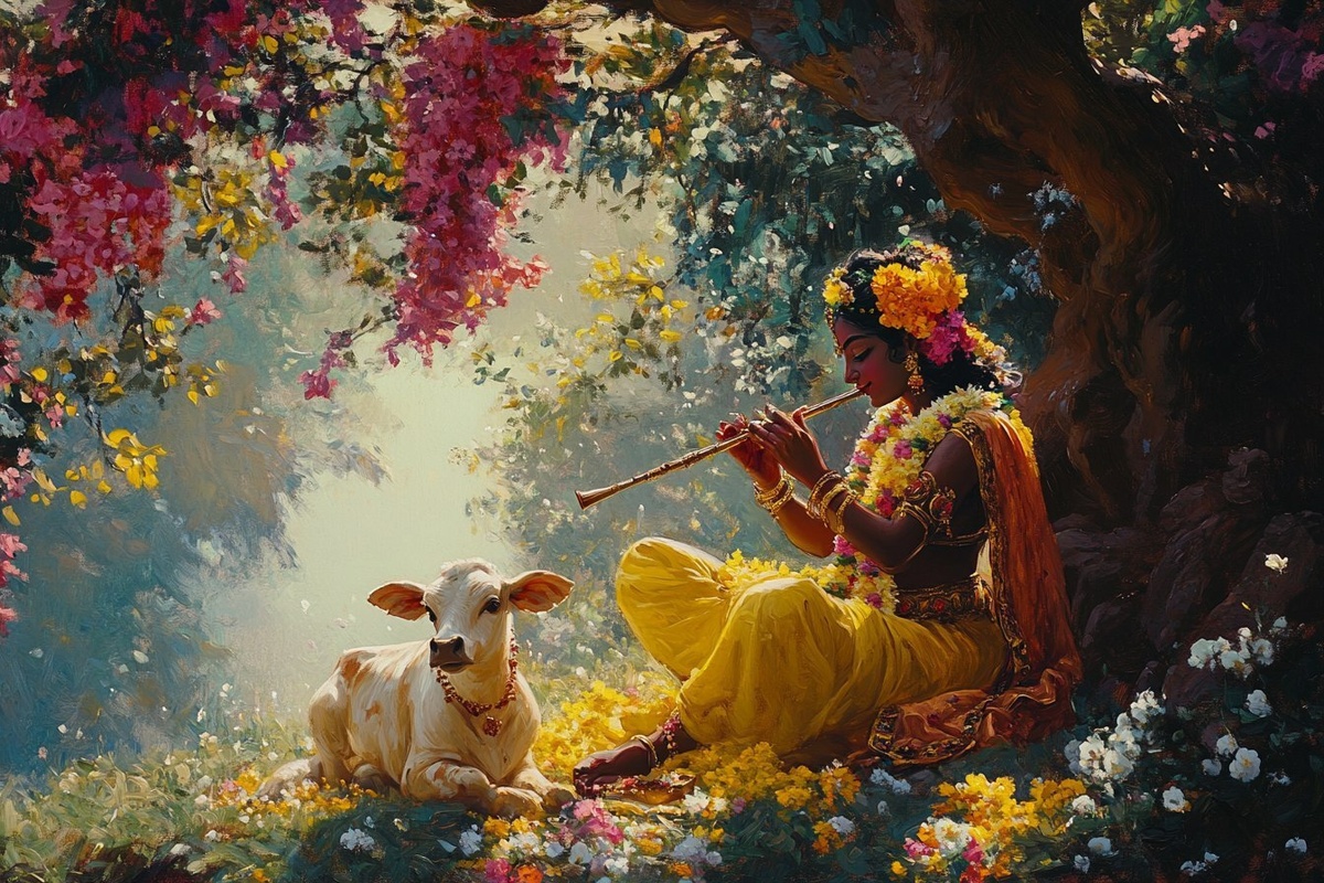 Создано на основе запроса: lord Krishna sitting underneath a tree and the tree has some colourful flowers, krishna playing his flute and a