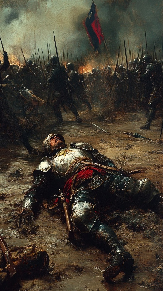 Создано на основе запроса: A fierce battle scene on a muddy field, a fallen French general lying on the ground in elaborate armor, soldiers still clashing in the distance --- Автоперевод: Яростная сцена сражения на грязном поле, упавший французский генерал, лежащий на земле в тщательно продуманных доспехах, солдаты все еще сталкиваются на расстоянии Как тебе такое изображение? 🤔 https://dzen.ru/id/65c0c65c86e4f837c27b24d7 #ИИ #AI #нейросеть #midjourney #art
