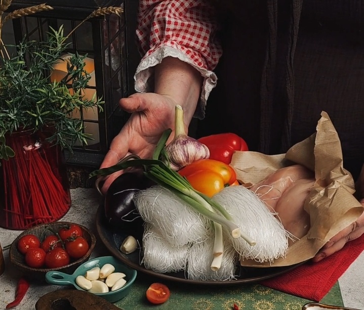 С любителями гастрономических путешествий хочу поделиться рецептом, который перенесет вас прямиком в уютные улочки Таиланда или Вьетнама, даже не выходя из кухни. Фунчоза с курицей и овощами — это идеальный баланс нежности, хруста и ярких специй. Готовы? Поехали! Нам понадобится: Лапшу залить кипятком и оставить на 5-7 минут. Мясо нарезать небольшими кусочками Баклажаны и перец нарезать небольшой соломкой Лук нарезать перьями или полукольцами. Томаты черри разделить пополам. Вначале обжарить мясо, когда оно станет золотистым добавить все овощи,кроме томатов.Пассировать около 10 минут, затем добавить томаты черри и томатную пасту. Посолить, поперчить. Вернуть на плиту и пассировать ещё 5 минут. После чего добавить лапшу, и соевый соус. Хорошо все перемешать и добавить мелко нарезанный зелёный лук. Блюдо готово. Подавать,посыпав сверху кунжутом и зелёным луком. Приятного аппетита! Видеоролик процесса приготовления по ссылке: