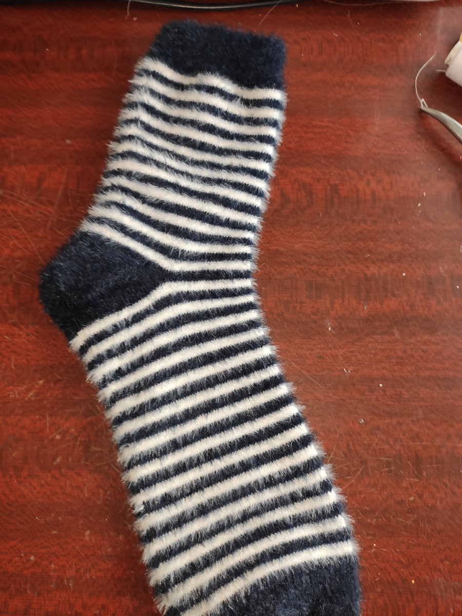 Подходит вчера ко мне наша малявочка Ириска и тихонько мне говорит: -"Сшей мне, пожалуйста теплый костюмчик." -Да зачем тебе, у нас дома тепло, батареи еще не отключили. -Мне надо, потом ласскажу. Думала я думала из чего же мне сшить теплую кофточку и нашла носочки тепленькие, брала большой размер, было написано мужские. -Вот такая кофточка тебе понравится? -Это же носок-, как я его одену? Не переживай все будет хорошо. Положила носочек перед собой, блин и воротничок охота сделать и на поясе охота резинку оставить. Но воротничок победил. Отрезала ближе к пяточке. И вот эту часть взяла на свитерок. Рукава сделала из средней части носка Остался ещё кусочек Верхняя резинка очень хорошо тянется, поэтому никакие пуговки и кнопочки делать не стала, да и вообще резать ничего не стала, потом отрезала детальки на рукава, сшила их эластичным швом. А в самом свитерочке сделала просто отверстия для рукавов, вставила их и на машинке прошила. Позвала Ириску на примерку Ну как, тебе нравится ?