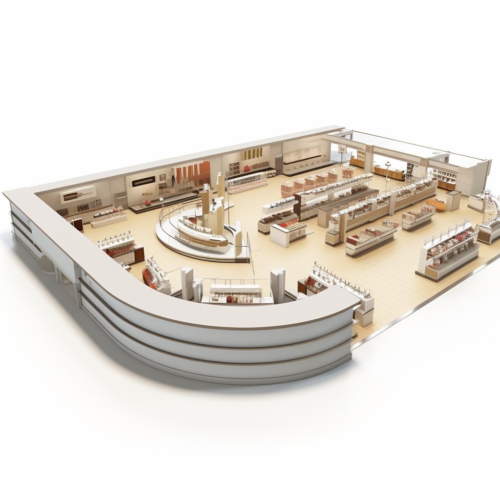 Создано на основе запроса: A 3d model of a 1950s department store floor, white background