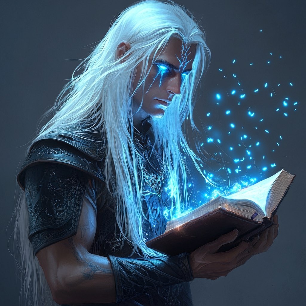 Создано на основе запроса: a male human with long white hair and sky blue eyes, glowing runes on his skin, dainty figure and a closed book