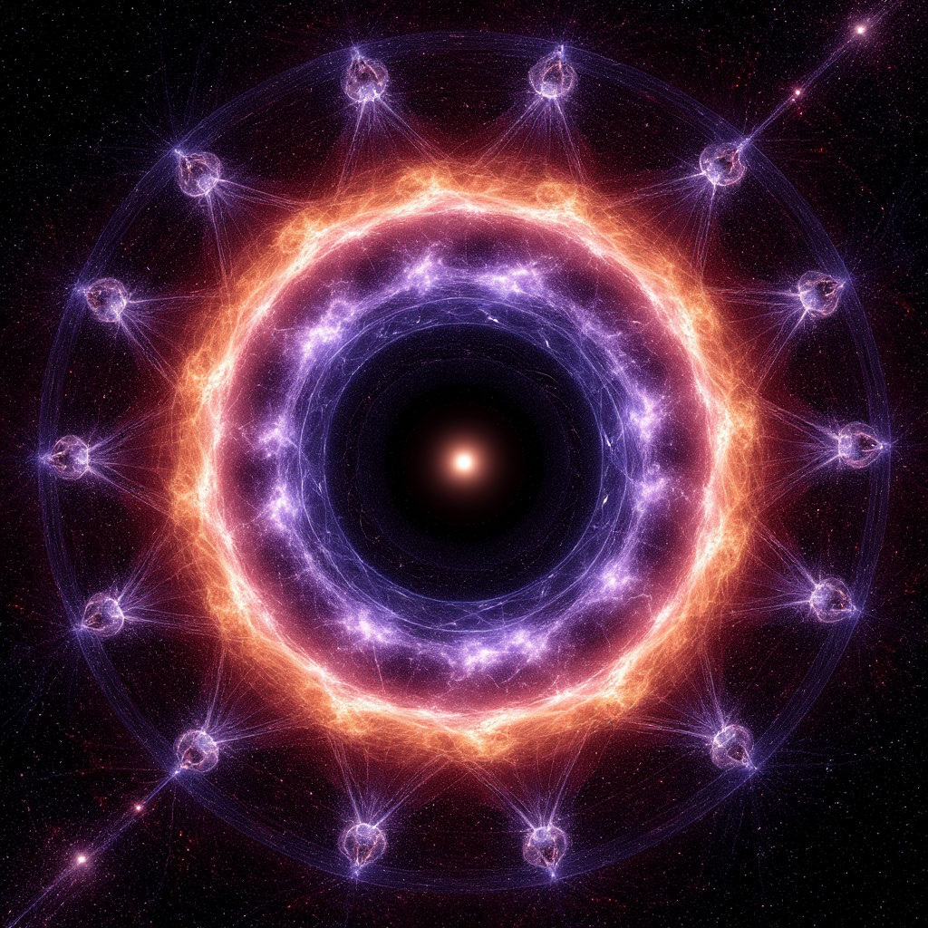 Глава 1: «Хор Безмолвных Ткачей» Лабиринт Вечности. Здесь не было ни верха, ни низа, ни прошлого, ни будущего. Только бесконечная пустота, пронизанная нитями света — нейтринными струнами, сплетёнными в узоры сложнее паутины. В этой пустоте парили **Нейтракин**. Их тела, полупрозрачные и мерцающие, напоминали медуз из жидкого хрусталя. Щупальца, сотканные из чистой энергии, тянулись на миллионы километров, касаясь струн реальности. Каждое прикосновение рождало вибрацию — ноту в симфонии творения. Они не говорили. Их общение заключалось в резонансе нейтринных полей. Когда один из Нейтракин вытягивал щупальце, другие повторяли движение, создавая гармоничные колебания. Так рождались вселенные. --- **Танец Создателей.** Группа Нейтракин, которых люди назвали бы **Хором**, собралась вокруг пульсирующего узла. Их щупальца синхронно дёргали струны: - **Изира** плела пространство, её колебания формировали трёхмерные структуры. - **Ксилон** настраивал время, закручивая струны в спир