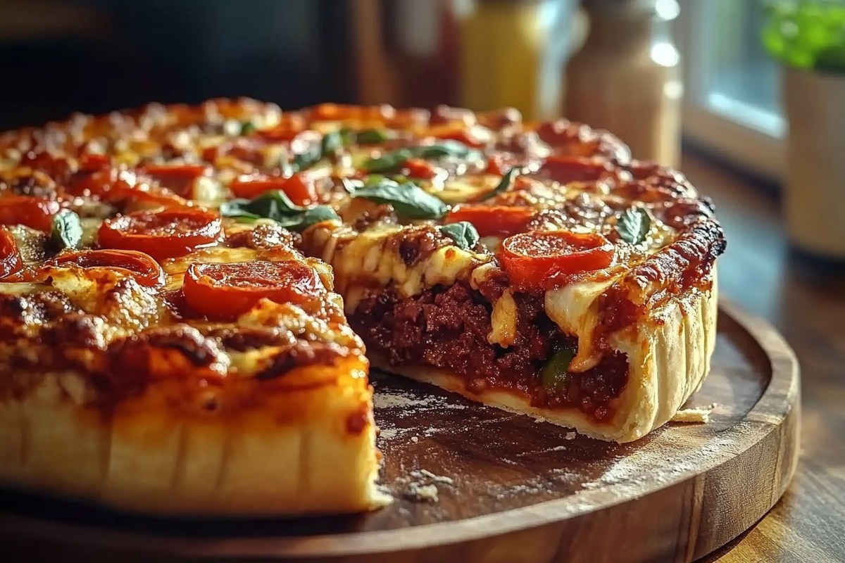 Создано на основе запроса: | Title: Deep-Dish Pizza Pie | STYLE: Close-up Shot right view | EMOTION: realistic as possible | SCENE: KEYWORD