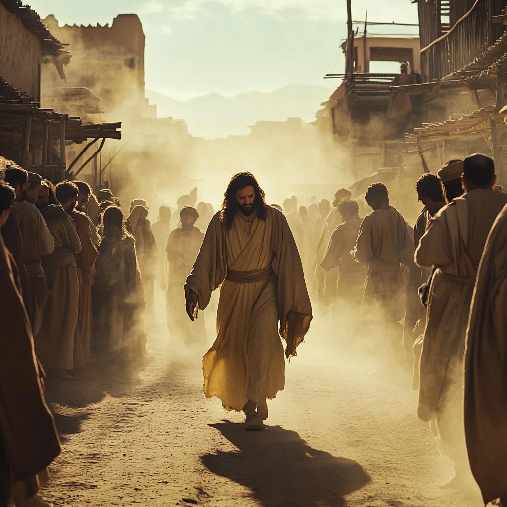 Создано на основе запроса: Jesus walking through a dusty road among people, Biblical times, traditional ancient robes, village setting
