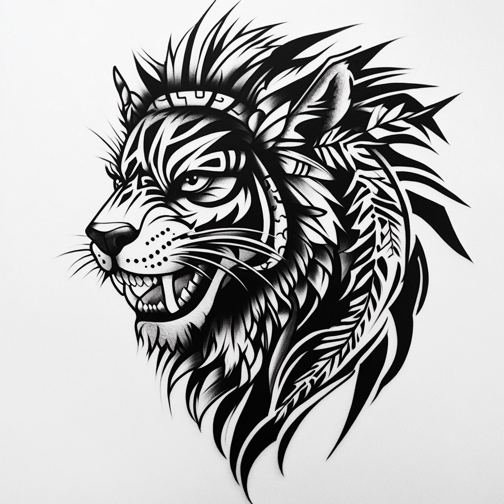 Создано на основе запроса: Tigre e inca ecuatoriano en estilo tattoo cartoon, líneas negras audaces, sin sombreado, detalles mínimos (como