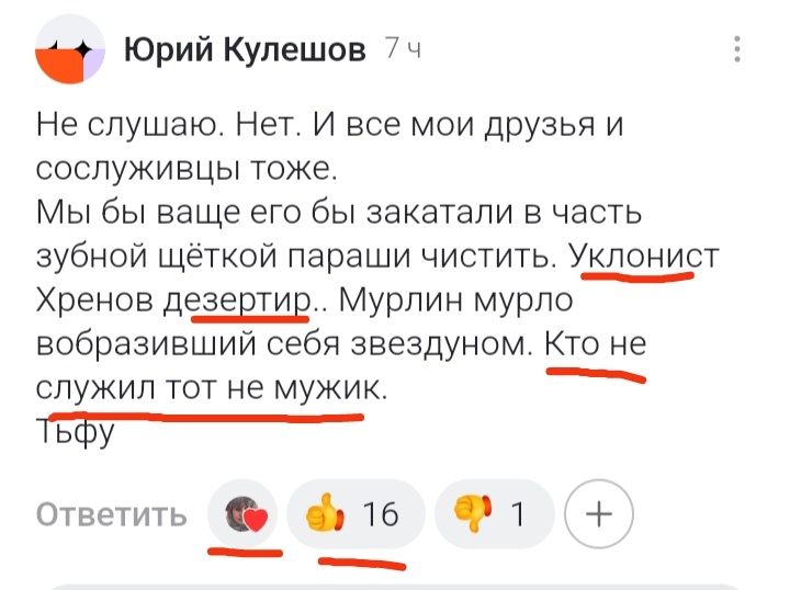 Здравствуйте, дорогие мои друзья! Считаю своей обязанностью довести до каждого читателя мнение людей с максимально пониженной социальной ответственностью, заключающееся в том, что кумирами должны быть только реальные мужики. Тёзка Шатунова под одобрение большей части аборигенов ижевского гетто во главе с удмуртаней (не путать с настоящими удмуртами и нормальными ижевчанами) с энтузиазмом завсегдатая дисциплинарных батальонов выдал "базу". Я даже расчувствовался. Я и сам не знаю, что бы сделал с тем человеком, который сначала уклонился от службы, а потом ещё и сбежал оттуда. Посмотреть бы на такого хоть разок... Хозяйка категорически согласна с лозунгами Юрочки, что и подтвердила своим шикарным лайком. Да где ж взять настоящих-то? Все разобраны и давно под каблуками уютно устроились. Последний лот "настоящих". Выбран сослепу, на удачу. Не плачьте, девушки, настоящие сотворены только для настоящих. И вот гетто "настоящих" заявило всему миру, что: царь не настоящий, король голый,