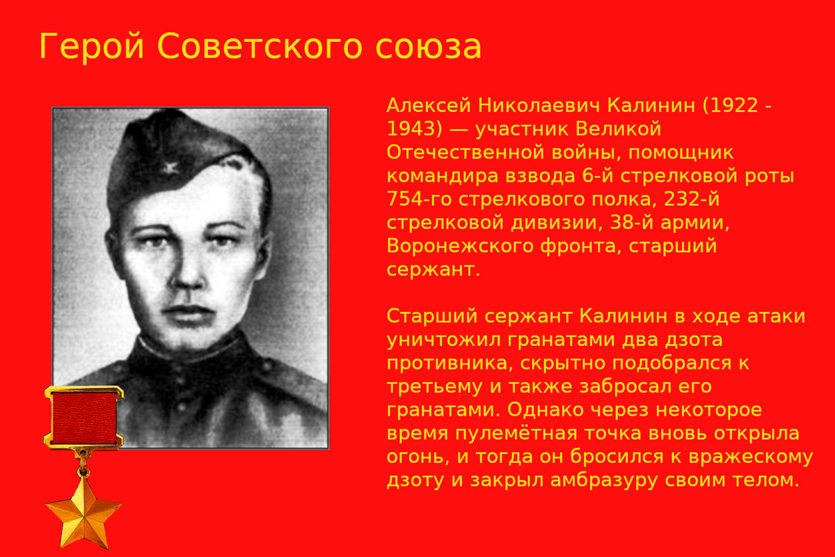 В условиях ожесточенного сражения проявил геройство 20 - летний старший сержант Алексей Калинин. Он вместе с бойцами атаковал дзоты противника, что стало решающим шагом в преодолении обороны врага. Его действия по уничтожению двух дзотов гранатами и окончательный подвиг, когда он закрыл амбразуру пулемёта своим телом, стали символом беспримерного мужества и самопожертвования.