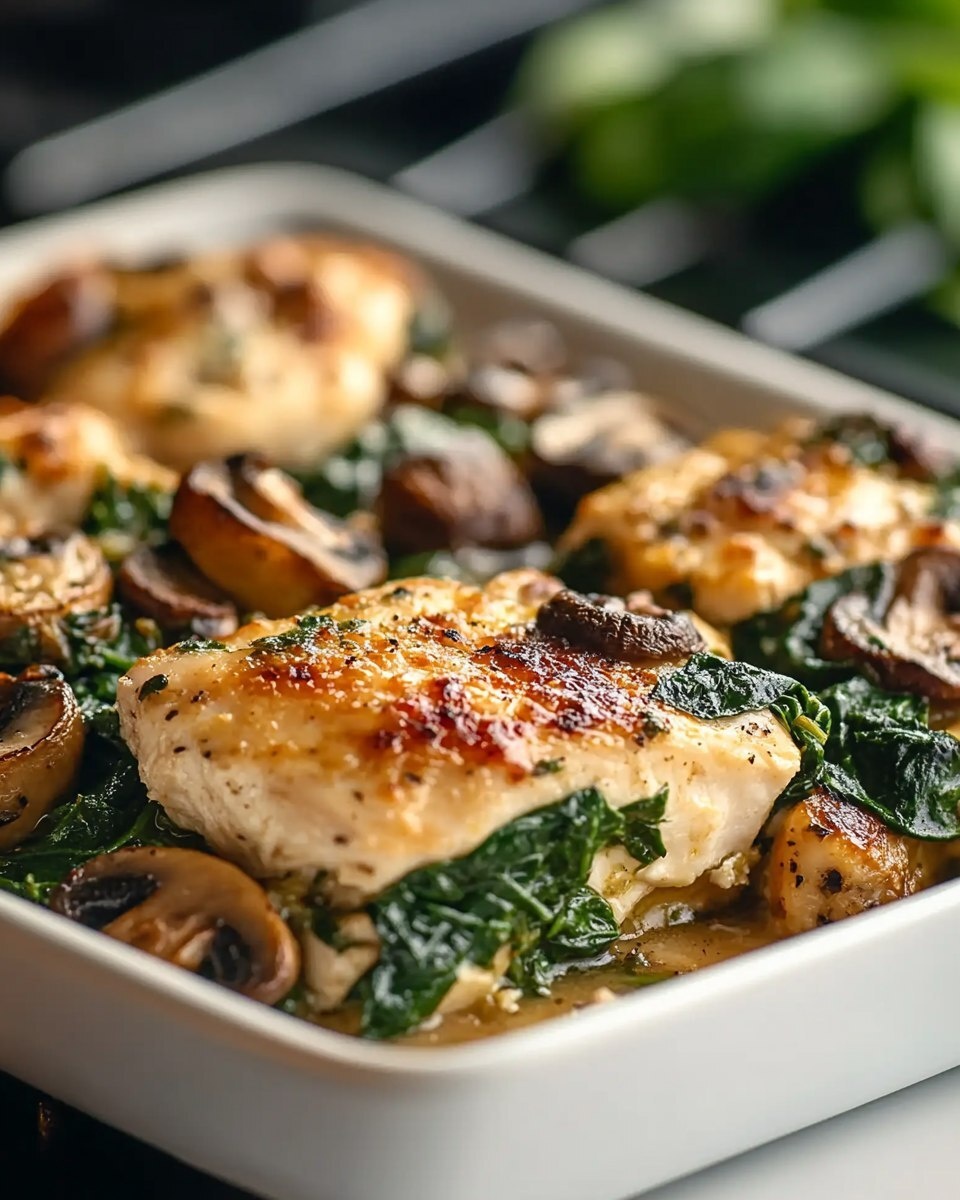 Создано на основе запроса: | Title: Chicken Spinach and Mushroom Low Carb Oven Dish | Close-up Shot right view, taken by a photographer with a high quality camera, served on a white plate, background of kitchen, very tasty, delicious, homemade, without any text, words or writing