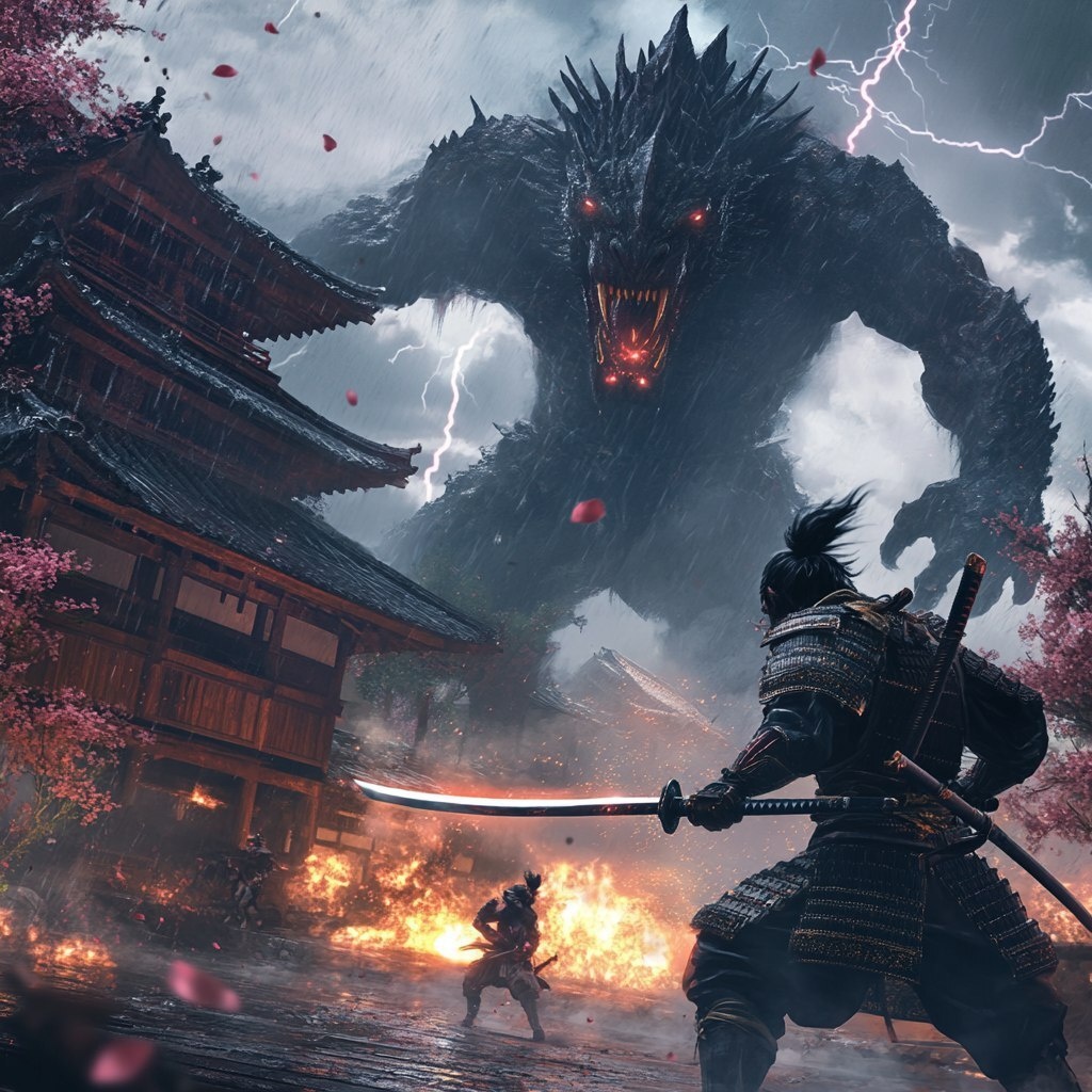 Создано на основе запроса: A hyper-realistic samurai in ornate, battle-worn armor wielding a glowing katana, leaping through the air to strike a colossal Kaiju monster towering over a burning feudal Japanese village, massive claws and glowing eyes, lightning flashing in the stormy sky, cherry blossom petals flying through smoke, cinematic action pose, ultra-detailed textures, dramatic lighting, 8k resolution, epic fantasy realism --- Автоперевод: Гиперреалистичный самурай в украшенной, обделенной в бою броне, владеющей светящейся катаной, прыгающей по воздуху, чтобы ударить колоссального монстра кайдзю, возвышающегося над горячим феодальным японским деревней, массивными когтями и светящимися глазами, молниеносные на штормовом небе, петли-лепестки с кумилем, на комитете, ультра-лепестки, драматические, демонстрируемые. Круто выглядит? 🤔 https://dzen.ru/id/65c0c65c86e4f837c27b24d7 #ИИ #AI #нейросеть #midjourney #art