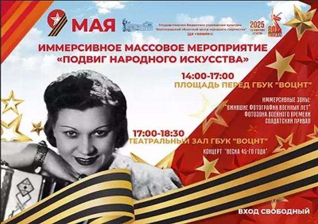 У волгоградского ДК «Химик» (бульвар Энгельса, 1а) в День Победы 9 мая развернётся массовое действо «Подвиг народного искусства». Оно пройдёт на нескольких площадках и в разных форматах. Будут работать фотозоны, выставка военной техники, концертная площадка, полевая кухня и многое другое. Гости узнают подробности из биографий выдающихся артистов и ансамблей, который неустанно и талантливо поддерживали наших воинов на фронте, тем самым внося большой вклад в достижение Великой Победы. Масштабный проект реализуется при поддержке гранта Министерства культуры РФ. Знак информационной продукции производителем не присвоен.