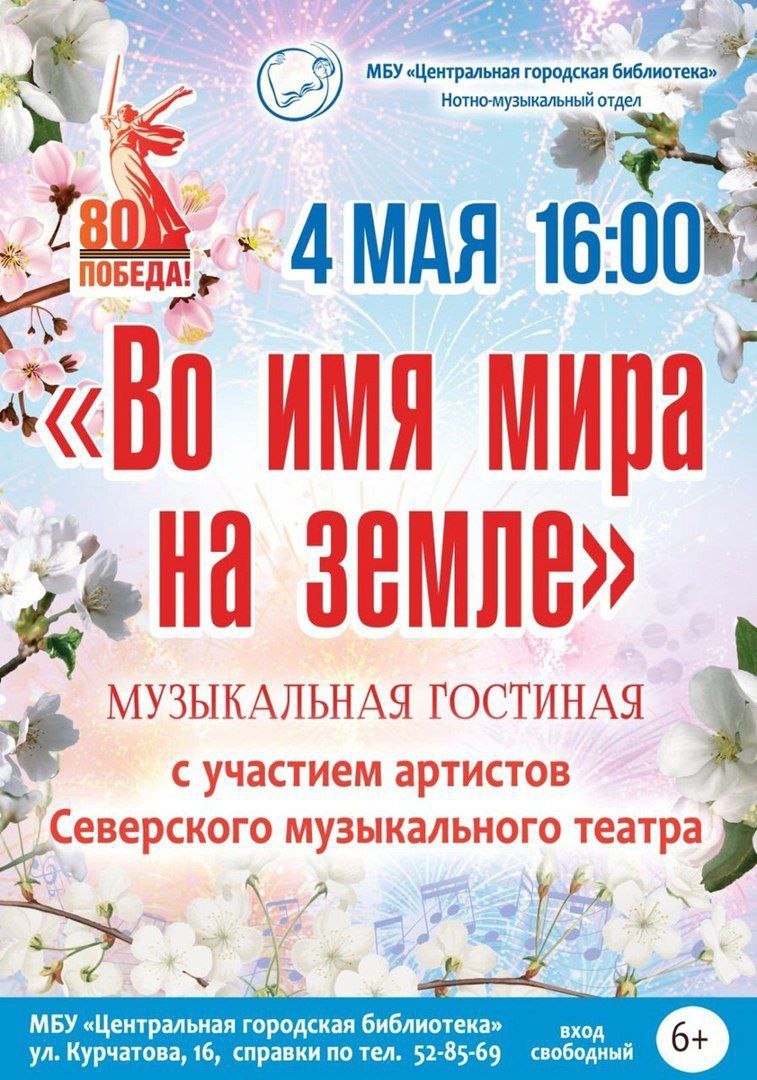 Центральная городская библиотека приглашает северчан в музыкальную гостиную Артисты Северского музыкального театра и воспитанники театрально-вокальной студии «Начало» выйдут на сцену, чтобы своим искусством воздать дань героям. Песни военных лет уже стали неотъемлемой частью нашего культурного кода. Вас будут ждать 4 мая в 16:00 в лекционном зале библиотеки по ул. Курчатова, 16 на 1 этаже. Вход свободный. Телефон для уточнения информации 52-85-69. #СеверскАфиша