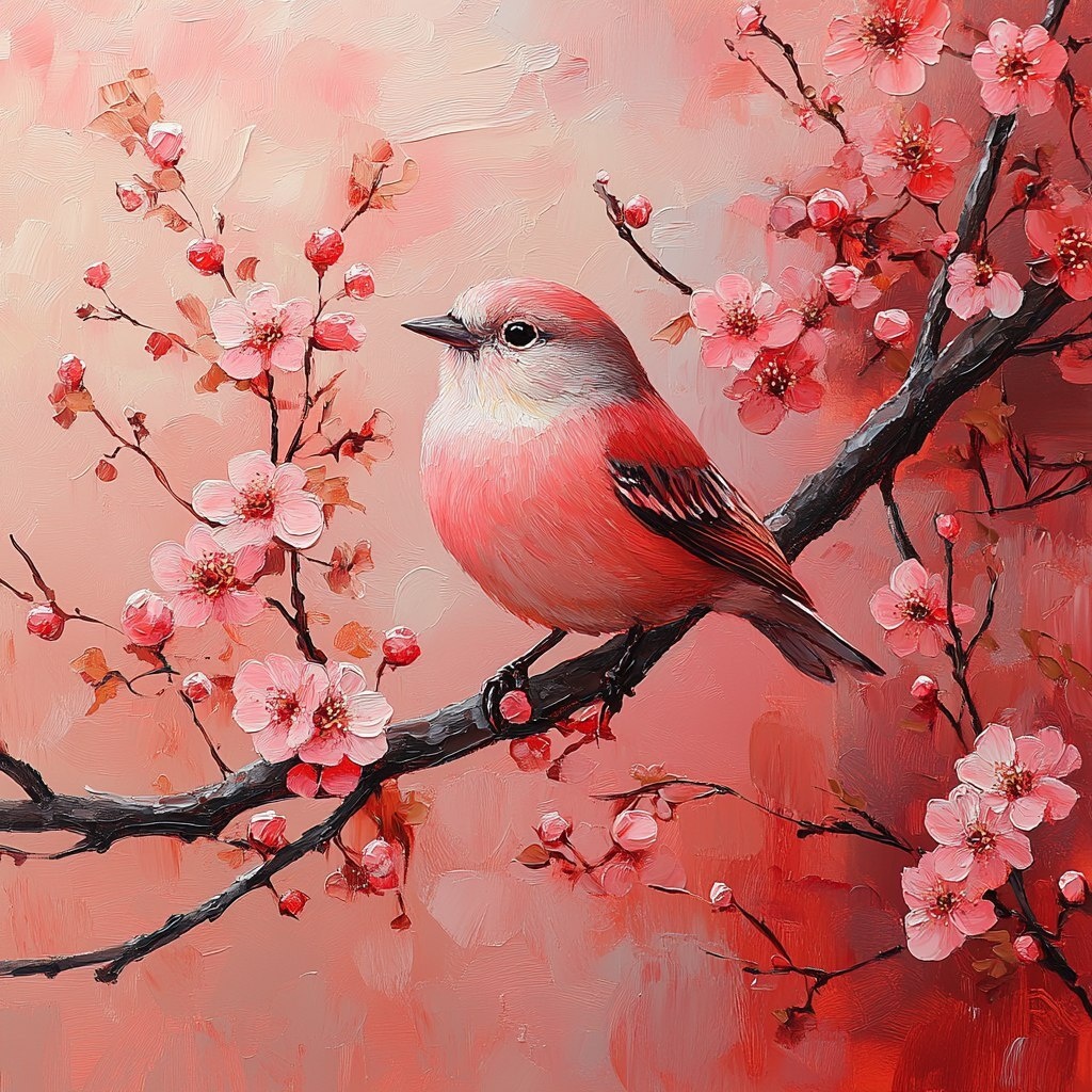Создано на основе запроса: pink sakura flowers tree branch illustration art style simple closeup acrylic painting art style with small bird