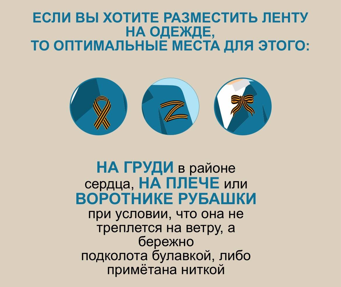 🎗️🎗️🎗️ 🖌️Как носить Георгиевскую ленту? ЕСЛИ ВЫ ХОТИТЕ РАЗМЕСТИТЬ ЛЕНТУ НА ОДЕЖДЕ, ТО ОПТИМАЛЬНЫЕ МЕСТА ДЛЯ ЭТОГО: ✅ НА ГРУДИ в районе сердца ✅ НА ПЛЕЧЕ лента должна быть примётана ниткой или приколота булавкой ✅ НА ВОРОТНИКЕ РУБАШКИ при условии, что она не треплется на ветру 🟠🟠🟠🟠 Не следует носить ленту на теле ниже уровня локтя, на аксессуарах и транспорте. Потерявшую опрятный вид ленту необходимо заменить на новую, получив у волонтёра! #Георгиевскаялента #ВолонтерыПобеды
