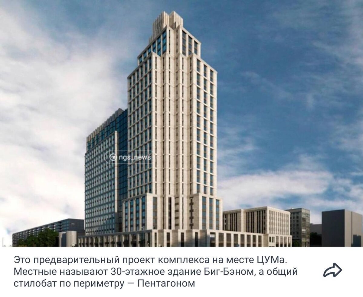 Пару дней назад появилась такая новость- Рестохолл, который был на месте универсама на Ленина закрывается. Есть мнения, что там вскоре построят дом.. К сожалению, знаковые места Новосибирска выкупают застройщики.. Так получилось и с нашим Цумом, там планируется возведение высотки. Предварительный проект включает в себя два дома: высотой 30 этажей и 8 этажей, а также двухэтажный деловой центр по периметру. Высотку «Расцветай» планирует разместить на пересечении Вокзальной магистрали и проспекта Димитрова, а 8-этажное здание — на том месте, где сейчас стоит ЦУМ. На фото - проект комплекса.