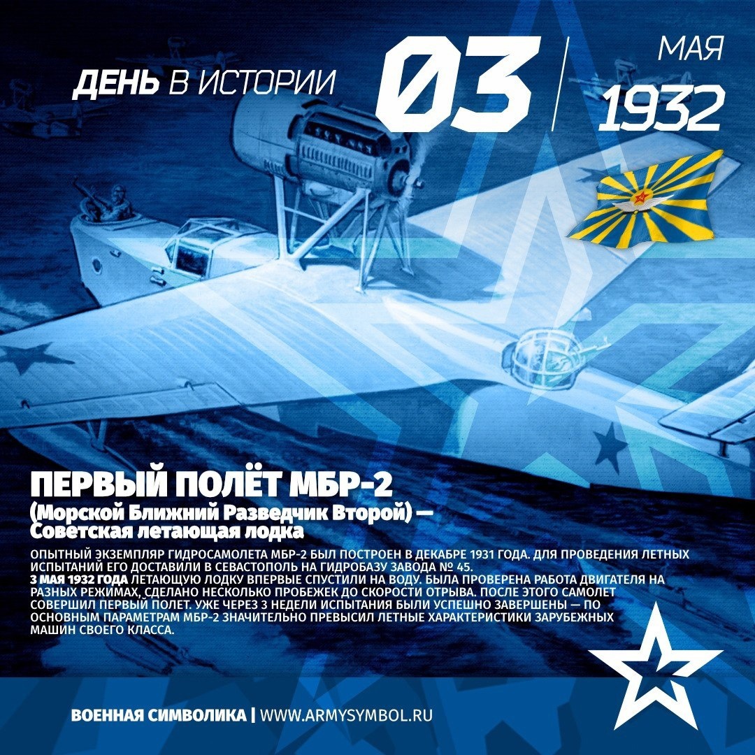 Первый полет МБР-2 в 1932 Опытный экземпляр гидросамолета МБР-2 был построен в декабре 1931 года. Для проведения летных испытаний его доставили в Севастополь на гидробазу завода № 45. 3 мая 1932 года летающую лодку впервые спустили на воду. Была проверена работа двигателя на разных режимах, сделано несколько пробежек до скорости отрыва. После этого самолет совершил первый полет. Уже через 3 недели испытания были успешно завершены — по основным параметрам МБР-2 значительно превысил летные характеристики зарубежных машин своего класса. #ПамятныеДатыВоеннойИсторииОтечества #ДеньВИстории #ГодЗащитникаОтечества #80ЛетВеликойПобеды Источник: https://vk.com/wall-60767131_30549 Подпишитесь на наши группы ВКонтакте и в Одноклассниках - читайте, смотрите и комментируйте! Источник