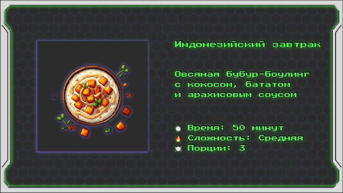 Индонезийский завтрак 🍚 Овсяная бубур-боулинг с кокосом, бататом и арахисовым соусом Этот рецепт представляет собой креативную интерпретацию классической индонезийской каши бубур, адаптированной для завтрака. В нем сочетаются сливочная овсянка, приготовленная на кокосовом молоке, сладкий батат, жареный лук-шалот и насыщенный арахисовый соус. Это блюдо соединяет текстуры и вкусы, характерные для Юго-Восточной Азии, и превращает их в питательное утро без мяса. Информация о рецепте: ⏱️ Время: 50 минут 🔥 Сложность: Средняя 🍽 Порции: 3 Ингредиенты: Для овсяной основы: • 🥥 Кокосовое молоко — 400 мл • 💧 Вода — 300 мл • 🌾 Овсяные хлопья (цельнозерновые) — 100 г • 🧂 Соль — ¼ чайной ложки • 🍯 Сироп агавы или мёд — 1 столовая ложка (по желанию) Для топпинга: • 🍠 Батат (сладкий картофель) — 1 крупный (около 250 г) • 🧅 Лук-шалот — 2 штуки • 🛢 Растительное масло — для жарки • 🌱 Микрозелень или кориандр — для украшения • 🌶 Красный чили — ½ штуки (по желанию) • 🍋 Лайм — для по