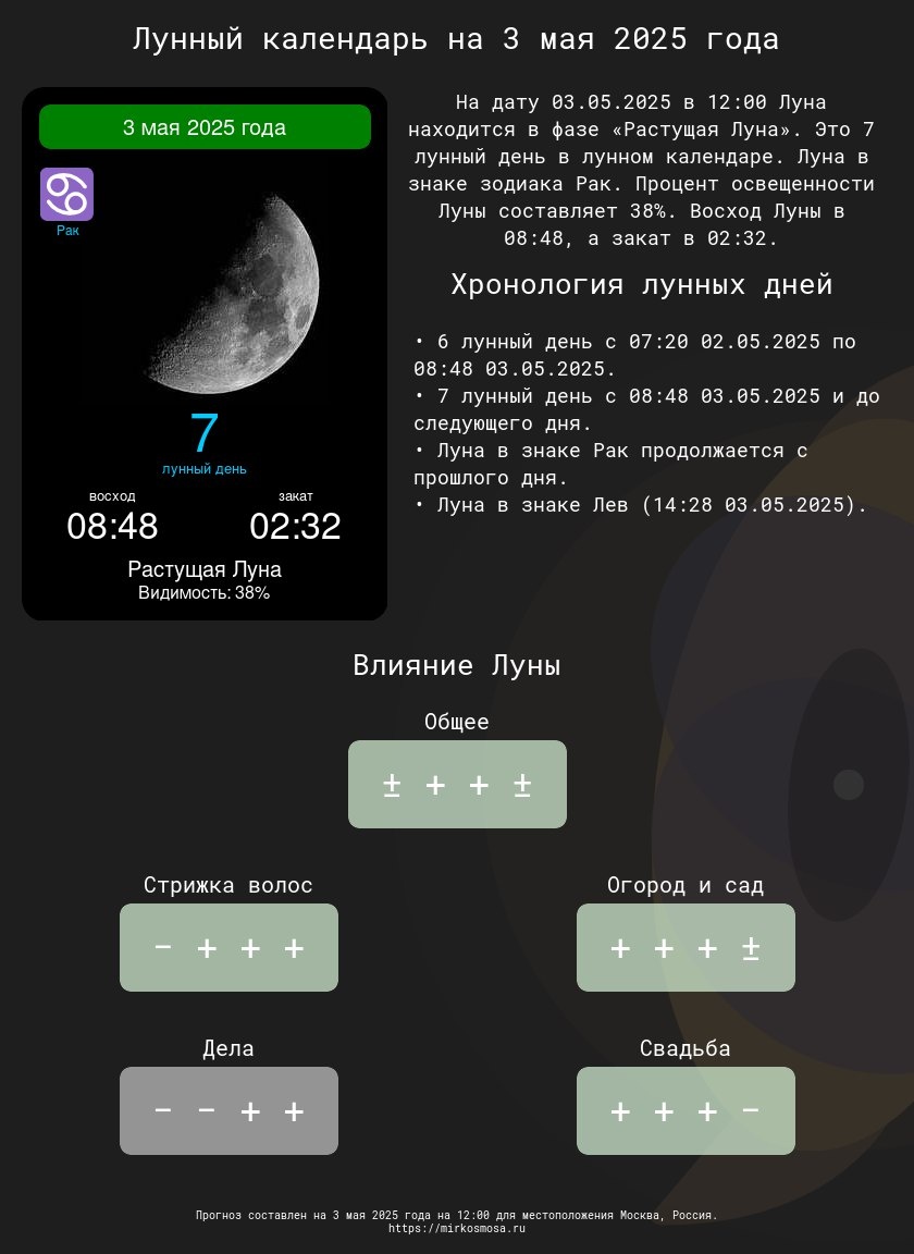 Лунные календари на 3 мая 2025 года: Подготовьтесь к этому дню с учетом влияния Луны! 🔹🌗 Лунный календарь на 3 мая 2025 года — Что приготовила Луна? Подробнее 🔹✂️ Лунный календарь стрижек на 3 мая 2025 года — Подходящий ли день для обновления прически? Подробнее 🔹🌱 Лунный календарь огородника и садовода на 3 мая 2025 года — Лучшее время для ухода за растениями. Подробнее 🔹📅 Лунный календарь дел на 3 мая 2025 года — Удачные моменты для важных задач. Подробнее 🔹💍 Лунный календарь свадеб на 3 мая 2025 года — Подходит ли этот день для вашего торжества? Подробнее
