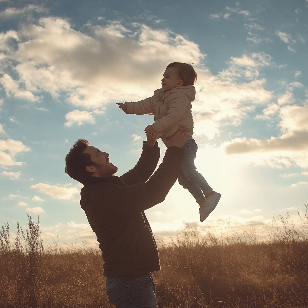 Создано на основе запроса: A father lifting his child toward the sky, symbolic of faith and future, modern day, light jacket and jeans