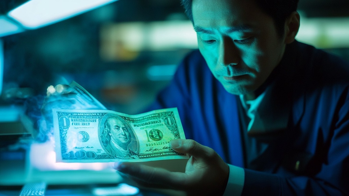 Создано на основе запроса: A counterfeit bill being detected under UV light by a bank employee in Japan, high detail, realism