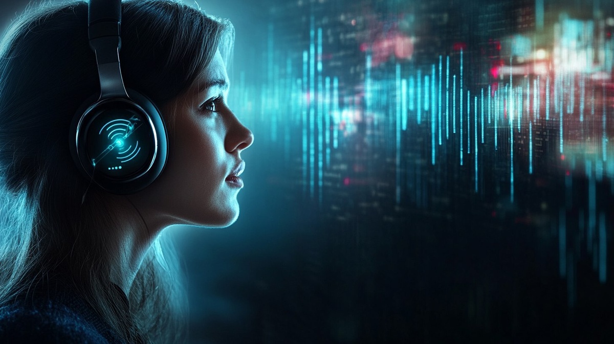 Создано на основе запроса: A scene of an investigator wearing headphones and monitoring voice recognition AI software, cybercrime setting