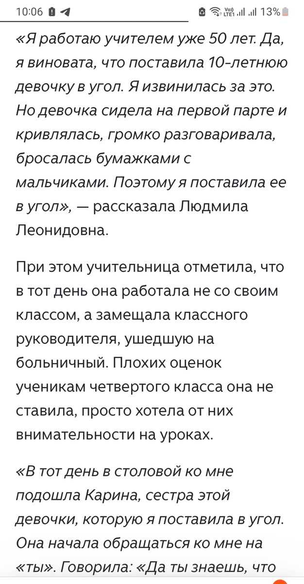 Напомню, о чем речь. Есть еще и аудиозапись. И вот мне написали, что надо бы выслушать и другую сторону. Разумеется, надо. Прочла я то, что учителя хотели сказать в свое оправдание. Посыла два: девочки сами: одна кривлялась (младшая), другая на "ты" к учителю обратилась. Второй посыл еще смешнее и нелепее: это не я, это другая учительница. Вот, что мне предложили в качестве опровержения. Факты остались фактами. Девочку обзывал класс, учительница ее за это наказала, а заступившуюся старшую сестру поставили на колени. Но, педагоги попытались оправдаться. Девочка кривлялась. Во - первых, после конфликта ребёнок может так эмоционировать. На то и началка, на то и специальные учителя начальных классов. Далее. Ребёнок якобы обратился на "ты". Эти оправдания напомнили мне оправдания человека, в отношении которого вынесен приговор и он признан виновным в насильственных действиях (132 УК РФ). Он, его жена, подруги утверждали, что девочки были грубы, тыкали ему, а оговорили из мести. Тольк