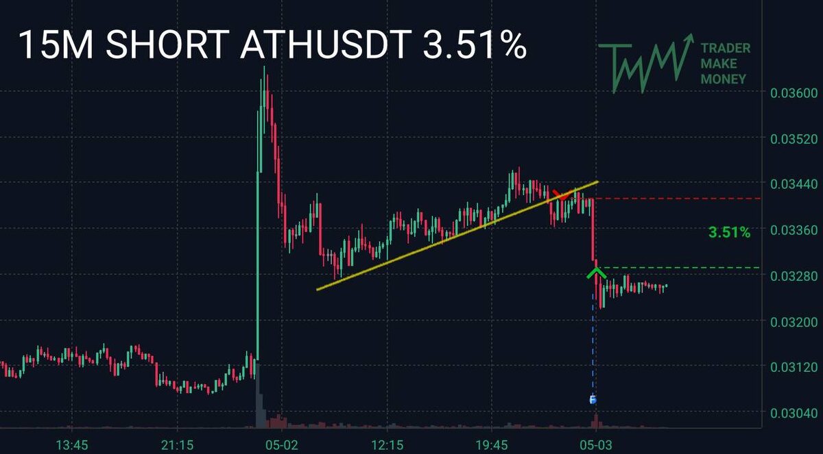 В ответ на пост #ATHUSDT Собирался уже спать, а тут пробитие наклонки которое я ждал весь день и даже пытался уже заходить, но движения не пошло. В этот раз в пробой не входил, а кинул лимитку на ретест уровня, стоп за наторговку R/R 1к4. Хорошая ночная сделка, приятное утро.