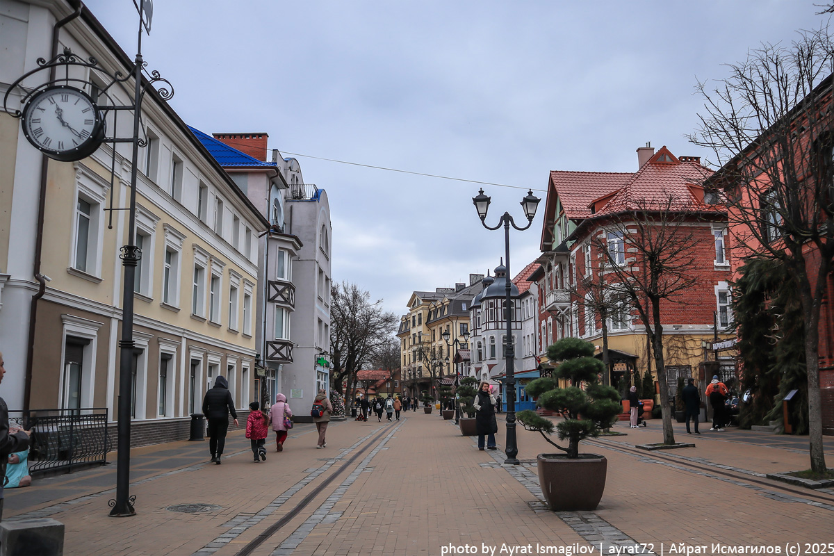 Мы полетели в направлении Балтики из Сибири, где в конце марта еще явная зима. Хотелось тепла, бесснежных улочек и ощущения курорта. И ощущения этого мы получили буквально на второй день, поехав в Зеленоградск, где знакомство с городом у нас началось с прогулки по Курортному проспекту. До начала 19-го века на месте Зеленоградска, или Кранца, если по-немецки, была рыбацкая деревушка. Примерно тогда в Европе началась мода на оздоровление морским воздухом и солнечными ваннами. В 1816 году появился морской курорт Кранц, уже в 1844-м получивший статус "королевского". Это еще не была построена железная дорога из Кенигсберга. Тупиковую ж.д. ветку до Кранца провели в 1885-м, что дало серьезный толчок развитию курорта. Со стороны ж.д.вокзала Курортный проспект начинается со здания Почтамта Кранца. Все краснокирпичное я люблю, поэтому обошел строение со всех сторон. Дворовая его сторона, с пристроями и башенками, показалась мне интереснее "парадных" сторон. На одном из фасадов панно на тему коти